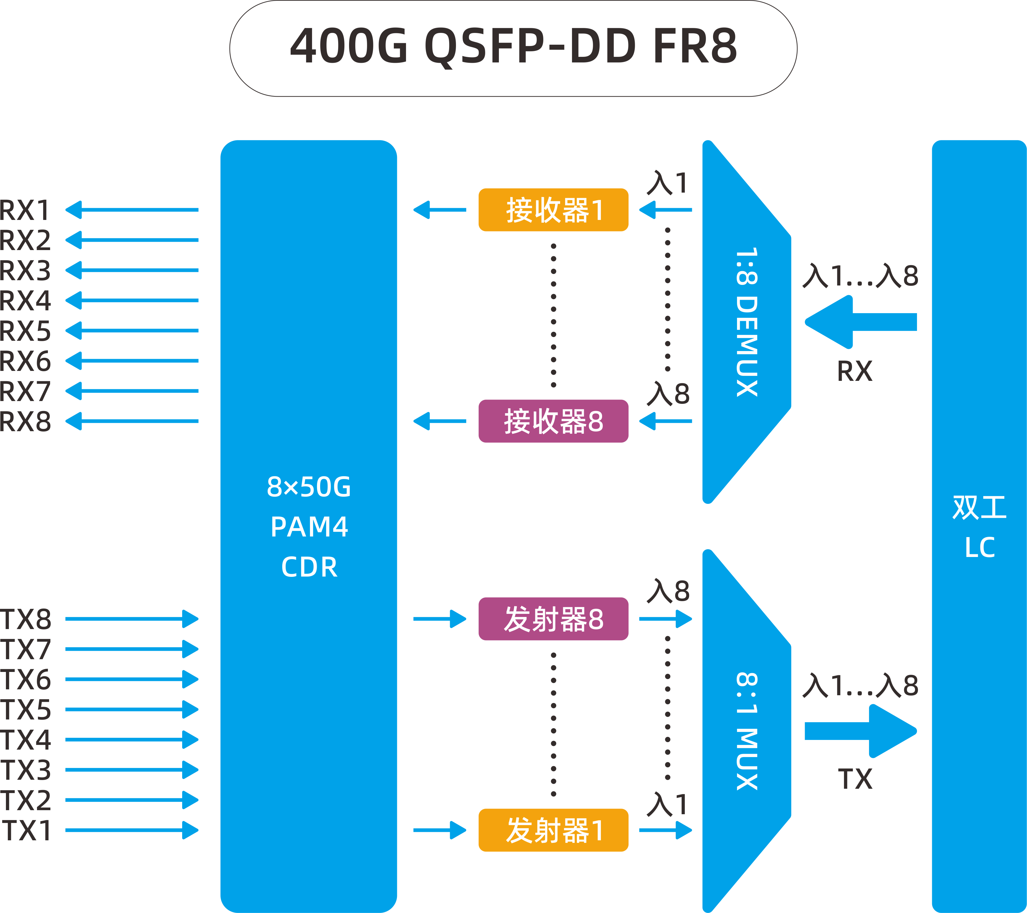 | 项目 | 400G QSFP-DD FR4 2km | 400G QSFP-DD FR8 2km |