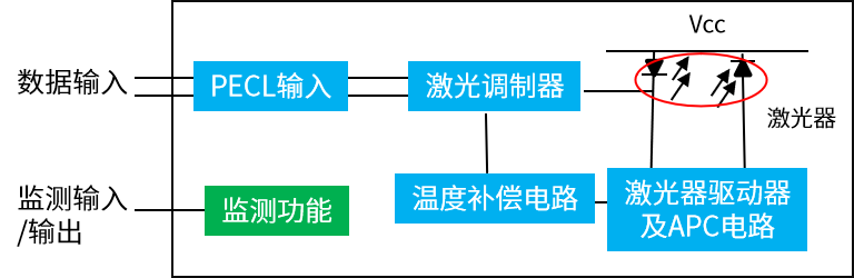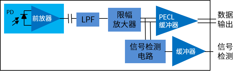 光接收部分以PIN为例,是由PINTIA(InGaAs PIN和跨阻放大器)和限幅放大器组成。将输入的光信号通过PIN管转换成光电流,光电流又通过跨阻放大器转换成电压信号。电压信号经限幅放大,并通过整形滤波器与限幅放大器产生差分DATA与DATA的数据信号交流输出。并具有无光告警功能,当光功率不足以维持模块正常工作时,SD端产生逻辑低信号,产生告警。