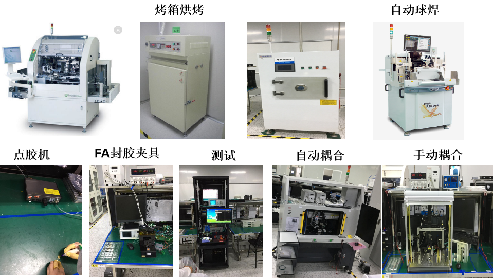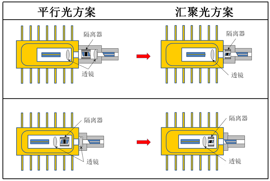 一般ROSA中封装有分光器、光电二极管(将光信号转换成电压)和跨阻放大器(放大电压信号),TOSA中封装有激光驱动器、激光器和复用器。TOSA、ROSA的封装工艺主要有以下四种: