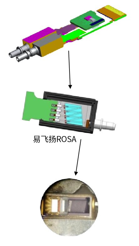 光模块封装的基本结构为光发射侧模块(TOSA)和驱动电路,光接收侧模块是(ROSA)和接收电路。TOSA、ROSA中的技术壁垒主要在于两方面:光芯片和封装技术,这也正是易飞扬的核心竞争力。