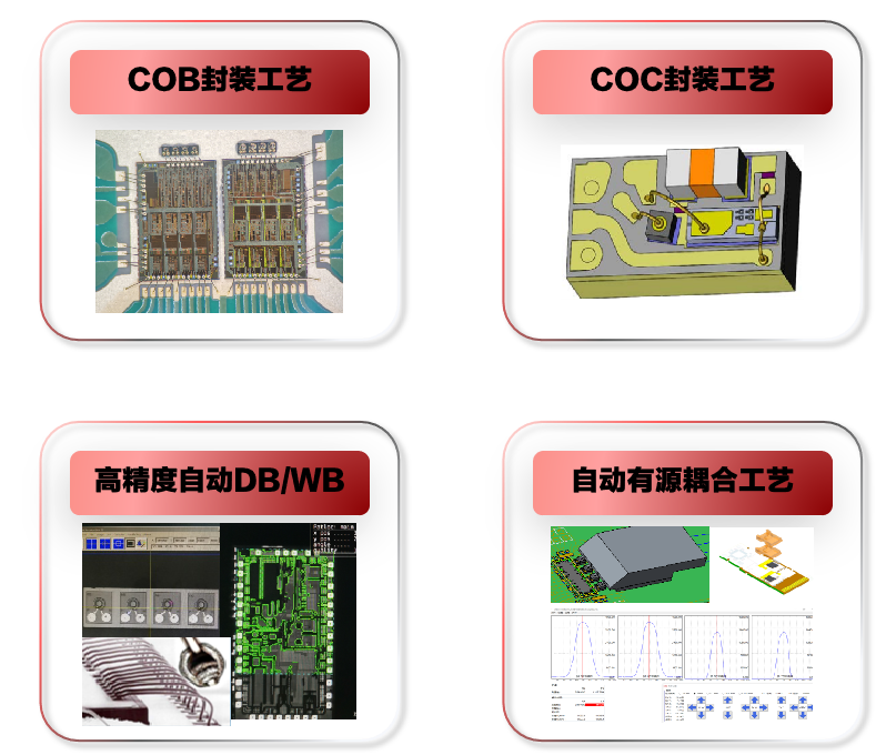 传统的单路10Gb/s或25Gb/s速率的光模块采用SFP封装将电芯片和TO封装的光收发组件焊接到PCB板上组成光模块。而100Gb/s光模块,在采用25Gb/s芯片时,需要4组组件,若采用SFP封装,将需要4倍空间。COB封装可以将TIA/LA芯片、激光阵列和接收器阵列集成封装在一个小空间内,以实现小型化。技术难点在于对光芯片贴片的定位精度(影响光耦合效果)和打线质量(影响信号质量、误码率)。