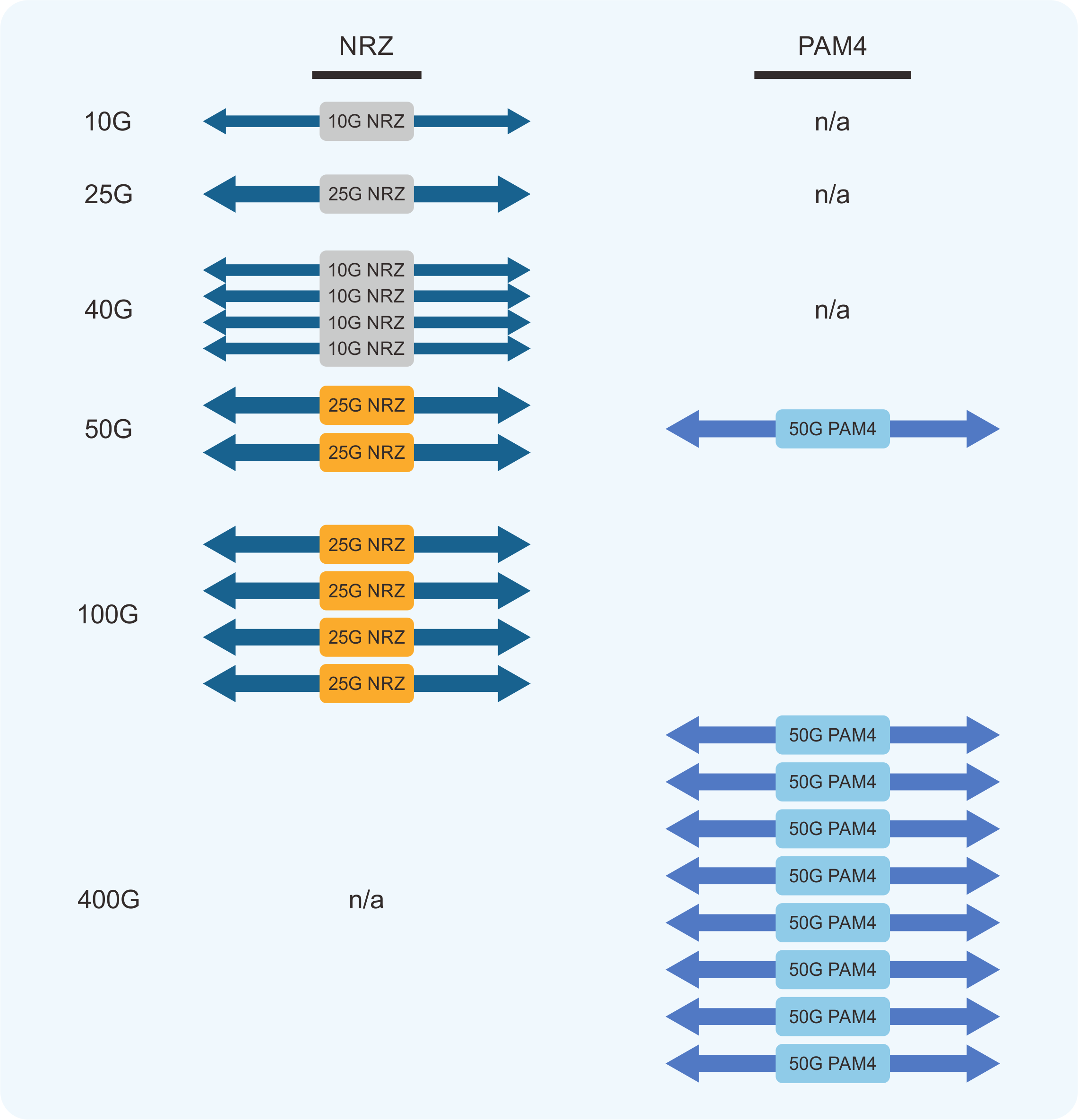 由于PAM4在每个符号时隙中传输两位,因此它将信号带宽减半。调制格式使得使用25GHz速率以50Gb/s传输数据成为可能。在SFP56的情况下,26.5625Gbaud的物理线路速率可用于实现51.125Gb/s的实际数据速率。SFP56电气接口则专为高达56Gb/s的信号速率而设计,以适应OTN开销。