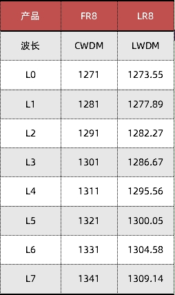 - FR8(CWDM8 10nm间隔)支持2公里,适用于数据中心之间短距离互连。