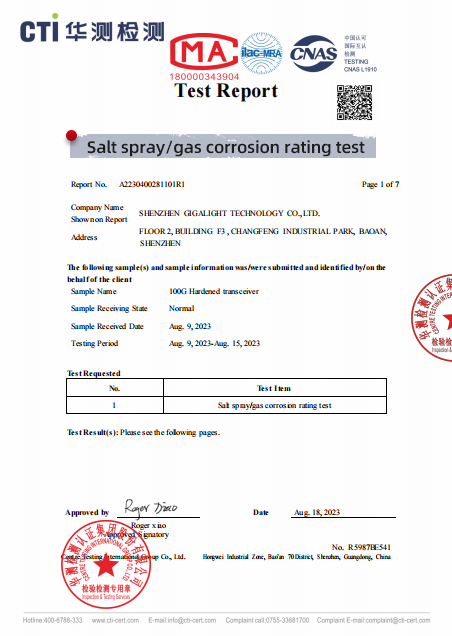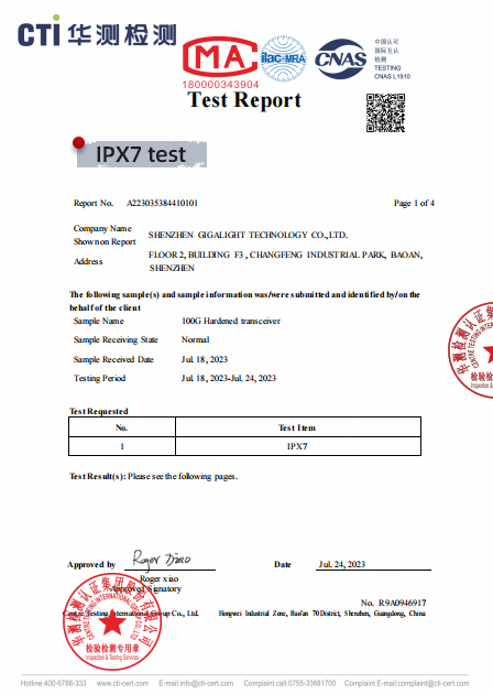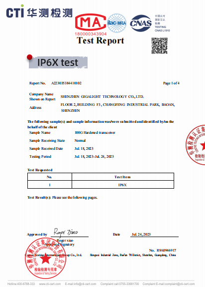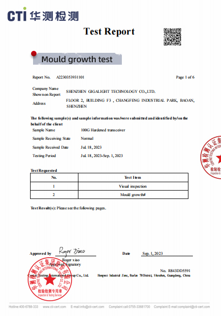 易飞扬1G/10G三防光模块已在低速系列产品形成批量出货,本次推出的100G QSFP28 SR4/PSM4/CWDM4三防光模块可支持工业级和商业级应用,能经受95%湿度可靠性测试并顺利通过国内权威机构华测检测鉴定:防水防尘特性测试满足IEC 60529标准IP67等级,防霉菌特性测试满足IEC 60068-2-10标准测试时长28天整体无霉菌,中性盐雾腐蚀特性测试满足GR 487标准。