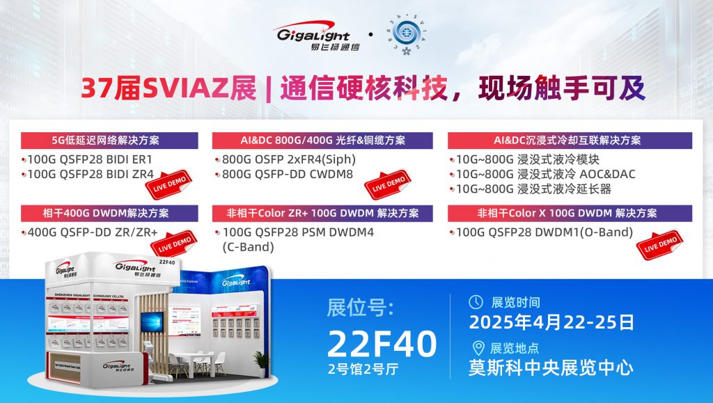[中国,深圳,2025年4月16日]2025年俄罗斯莫斯科通讯展览会(SVIAZ 2025)将于4月22日至25日在莫斯科中央展览中心(Expocentre Fairgrounds)隆重举行。易飞扬(GIGALIGHT)将携多项创新光互连产品和解决方案亮相本次展会,展位号为:22F40,Pavilion 2 Hall 2 , 诚邀全球客户及合作伙伴莅临交流。